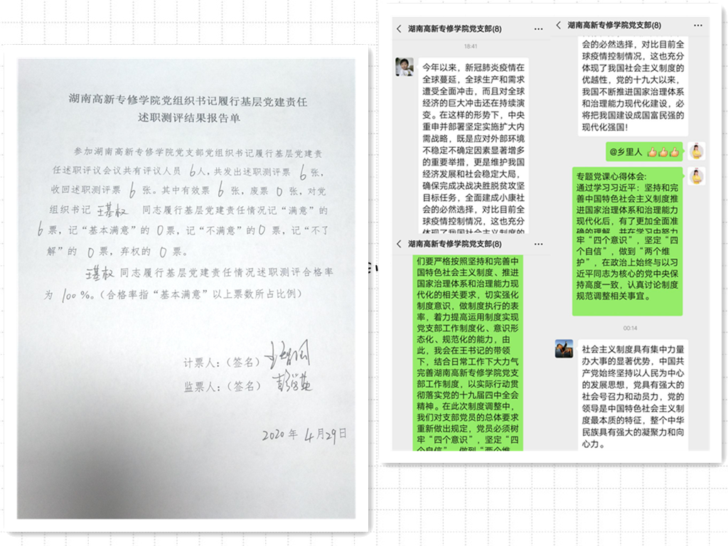 全體(tǐ)黨員(yuán)對(duì)黨支部書(shū)記王基權同志(zhì)進行(xíng)了(le)不(bù)記名測評投票(piào),湖南商貿經濟管理專修學院黨組織書(shū)記履行(xíng)基層黨建責任述職測評結果為(wèi)王基權同志(zhì)履行(xíng)基層黨建責任情況述職測評合格率為(wèi) 100 %。